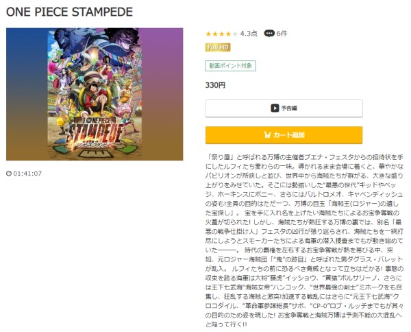 映画「ONE PIECE STAMPEDE」の動画は330円でレンタル配信してるので、フルで無料視聴できます。