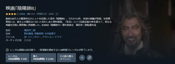 ただ、映画「陰陽師2」の関連作品の映画は配信しているので、見放題で視聴は可能です。