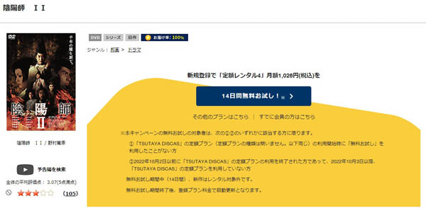 TSUTAYA DISCASで映画「陰陽師2」をDVDレンタルで無料視聴