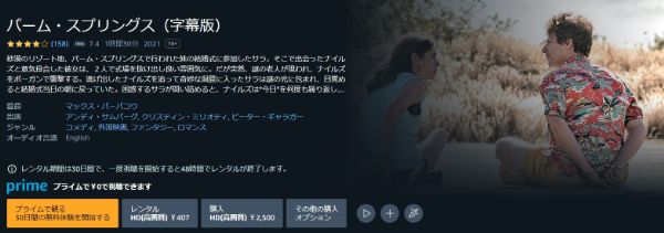 Amazonプライムビデオは、30日間のお試し無料期間があり「パーム・スプリングス」の映画をフルで視聴することができます。