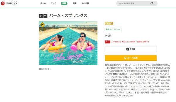 music.jpは、初回登録で1,600Ptが貰えるので「パーム・スプリングス」の映画を無料で見ることができます。