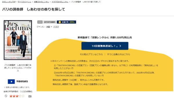 お試し期間が31日間なので、映画「パリの調香師 しあわせの香りを探して」の動画や関連動画も含め、TSUTAYA DISCASなら自分のペースでゆっくり視聴できます。