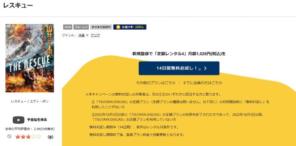 お試し期間が14日間なので、映画「レスキュー」の動画や関連動画も含め、TSUTAYA DISCASなら自分のペースでゆっくり視聴できます。