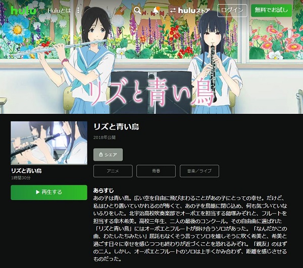 Huluで映画「リズと青い鳥」をフルで無料視聴