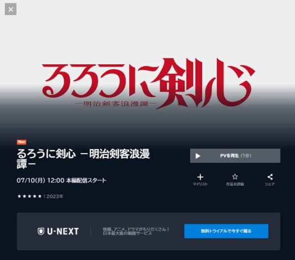 先に結論をお伝えすると、アニメ「るろうに剣心」は、『U-NEXT』では全5作品のうち、1作品をフルで配信しており、無料で視聴が可能です。