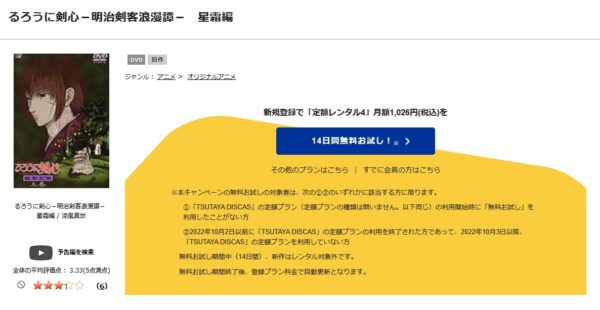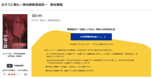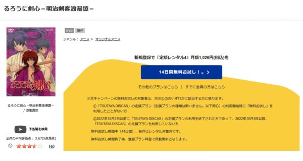 TSUTAYA DISCASは、準新作は8枚まで、話題作・旧作は枚数制限なしでお試し期間中に無料レンタルができ「るろうに剣心」シリーズのアニメは、旧作なので無料視聴可能です。
