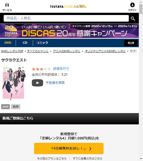 TSUTAYA DISCASは、準新作は8枚まで、話題作・旧作は枚数制限なしでお試し期間中に無料レンタルができ「サクラクエスト」のアニメは、旧作なので無料視聴可能です。