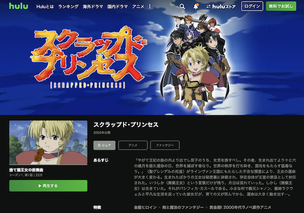 ただ、アニメ「スクラップド・プリンセス」の動画は視聴できないので、スクラップド・プリンセスを見たい場合はHuluをお試しください。