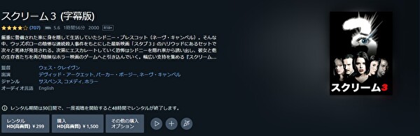 映画「スクリーム3」は299円でレンタル配信してるので、フルで視聴できます。