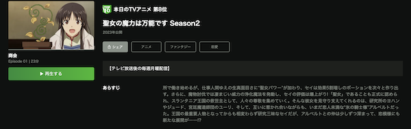 初回お試し期間が2週間があり、2024年11月現在、アニメ「聖女の魔力は万能です Season2(2期)」の1話から最終話(12話)まで見ることができます。