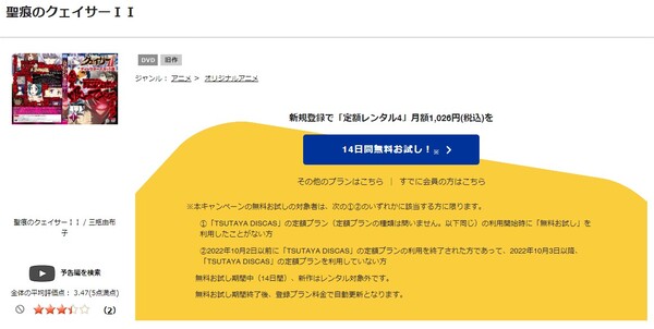 TSUTAYA DISCASは、準新作は8枚まで、話題作・旧作は枚数制限なしでお試し期間中に無料レンタルができ「聖痕のクェイサーII」のアニメは、旧作なので無料視聴可能です。