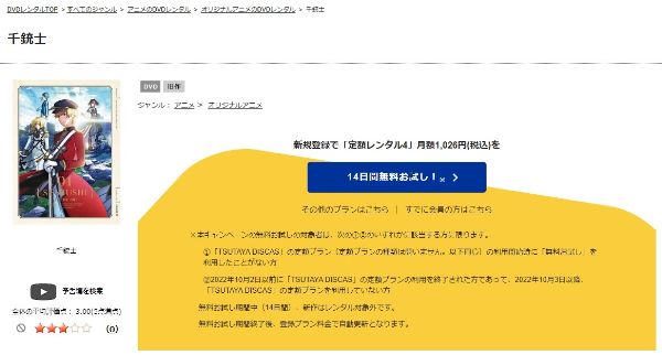 TSUTAYA DISCASは、準新作は8枚まで、話題作・旧作は枚数制限なしでお試し期間中に無料レンタルができ「千銃士」のアニメは、旧作なので無料視聴可能です。