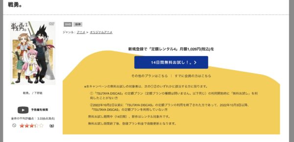 TSUTAYA DISCASは、準新作は8枚まで、話題作・旧作は枚数制限なしでお試し期間中に無料レンタルができ「戦勇。(第2期)」のアニメは、旧作なので無料視聴可能です。