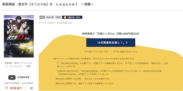 そして、映画「 新劇場版 頭文字[イニシャル]D Legend 1 -覚醒-」はツタヤディスカスで配信しているので、無料でDVDレンタルが可能です。