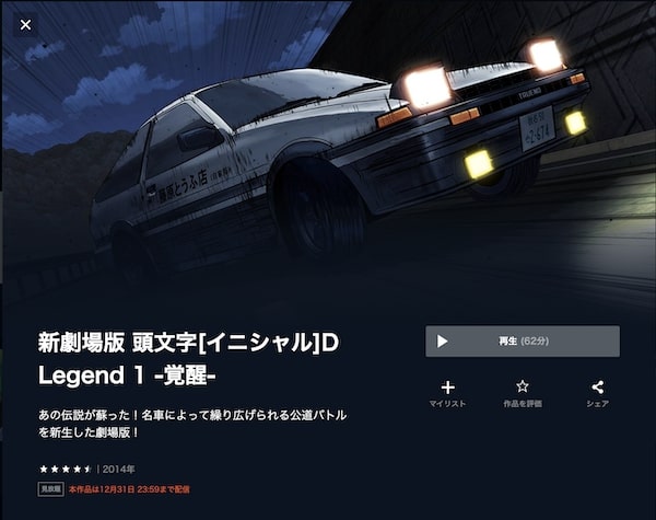 理由は、31日間の無料期間があり、「 新劇場版 頭文字[イニシャル]D Legend 1 -覚醒-」の映画をフルで配信しているからになります。
