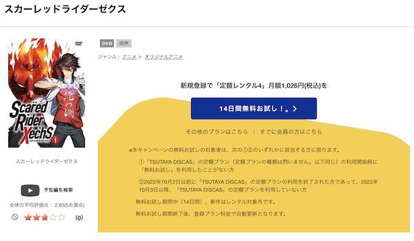 TSUTAYA DISCASは、準新作は8枚まで、話題作・旧作は枚数制限なしでお試し期間中に無料レンタルができ「スカーレッドライダーゼクス」のアニメは、旧作なので無料視聴可能です。