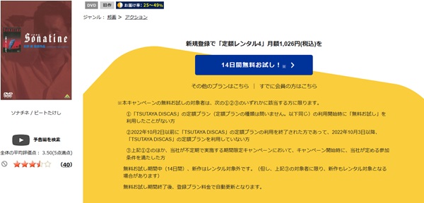 TSUTAYA DISCASには30日間の無料トライアルがあり、期間中には映画「ソナチネ」を無料視聴できます。