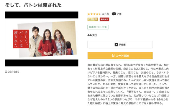 映画「そして、バトンは渡された」は440円でレンタル配信してるので、フルで視聴できます。
