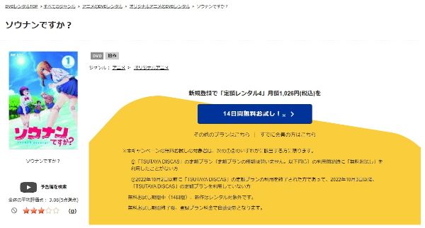 TSUTAYA DISCASは、準新作は8枚まで、話題作・旧作は枚数制限なしでお試し期間中に無料レンタルができ「ソウナンですか?」のアニメは、旧作なので無料視聴可能です。