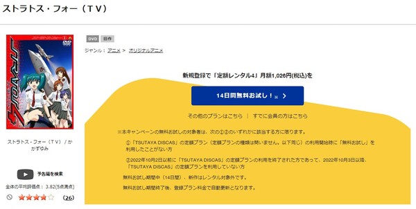 TSUTAYA DISCASは、準新作は8枚まで、話題作・旧作は枚数制限なしでお試し期間中に無料レンタルができ「ストラトス・フォー」のアニメは、旧作なので無料視聴可能です。