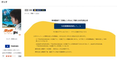 そして、映画「タッチ」はツタヤディスカスで配信しているので、無料でDVDレンタルが可能です。