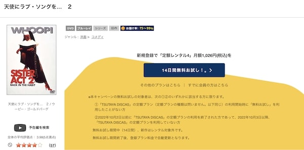 そして、映画「天使にラブソングを2」はツタヤディスカスで配信しているので、無料でDVDレンタルが可能です。