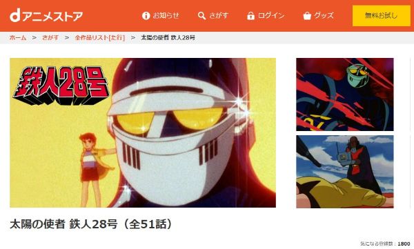 またdアニメストアは、アニメ「太陽の使者 鉄人28号」のシリーズや関連動画を全話視聴できます。