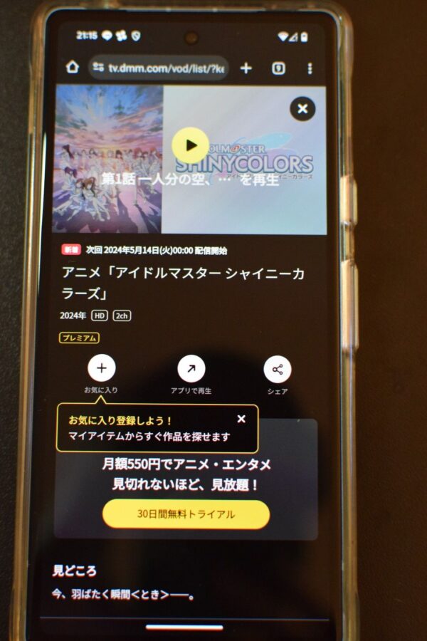 初回お試し期間が30日間あり、アニメ「アイドルマスター シャイニーカラーズ」の1話~最新話(5話)が配信されております。