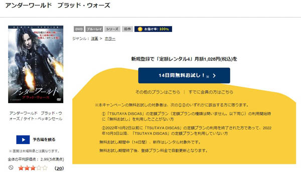 ツタヤディスカスは、準新作・話題作・旧作が4枚までなら、無料お試し期間中にレンタルができるので、「アンダーワールド ブラッド・ウォーズ」の映画を無料で視聴した後も14日間以内なら他のシリーズ作品や見たかった映画も無料でレンタルすることができますよ。