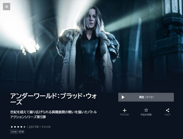 また、映画「アンダーワールド ブラッド・ウォーズ」のシリーズ作品の映画もフルで無料視聴が可能です。