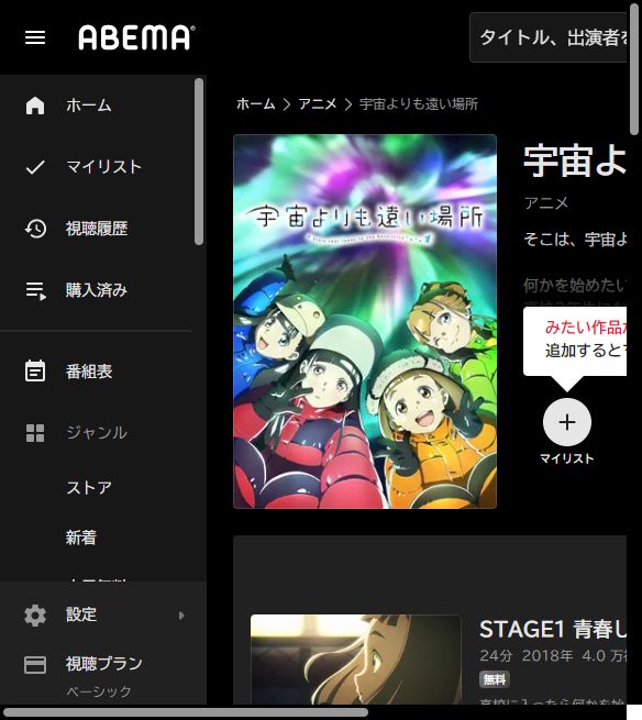 また、ABEMAは独自のオリジナル動画やコンテンツがあり、アニメ「宇宙よりも遠い場所」以外も視聴できます。