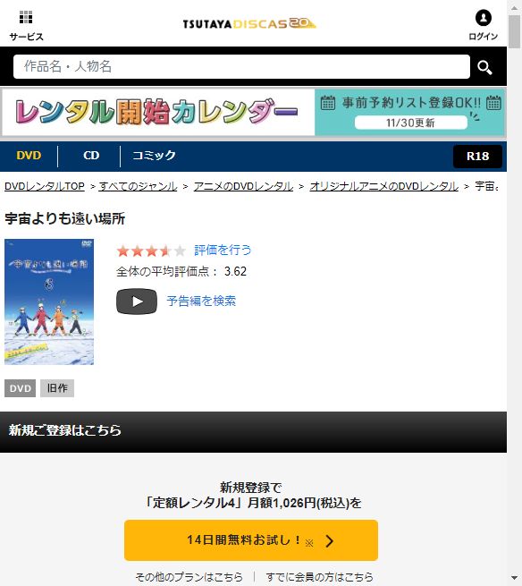 TSUTAYA DISCASは、準新作は8枚まで、話題作・旧作は枚数制限なしでお試し期間中に無料レンタルができ「宇宙よりも遠い場所」のアニメは、旧作なので無料視聴可能です。