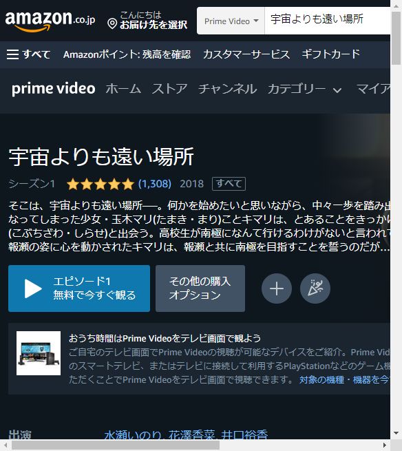 Amazonプライムはアニメ「宇宙よりも遠い場所」は無料で視聴できませんが、関連動画やシリーズ作品には見放題で配信されているものもあります。