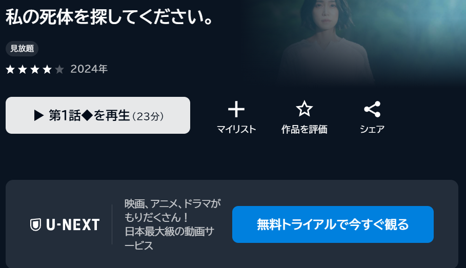 「私の死体を探してください。」は、U-NEXTで配信しており見放題なので無料トライアル中に全話視聴ができます。