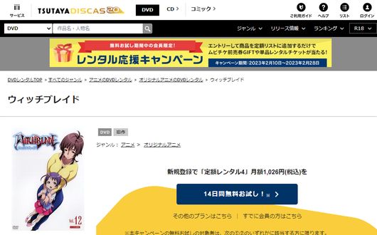 TSUTAYA DISCASは、準新作は8枚まで、話題作・旧作は枚数制限なしでお試し期間中に無料レンタルができ「ウィッチブレイド」のアニメは、旧作なので無料視聴可能です。