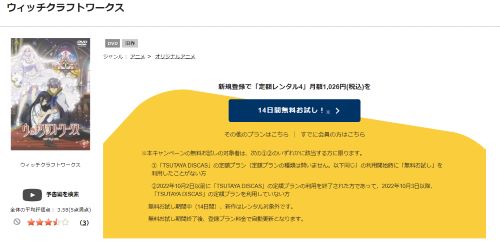 TSUTAYA DISCASは、準新作は8枚まで、話題作・旧作は枚数制限なしでお試し期間中に無料レンタルができ「ウィッチクラフトワークス」のアニメは、旧作なので無料視聴可能です。