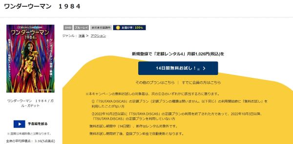 そして、映画「ワンダーウーマン1984」はツタヤディスカスで配信しているので、無料でDVDレンタルが可能です。