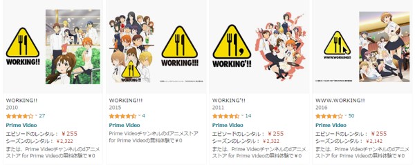 結果、Amazonプライムビデオの「dアニメストア for Prime Video」でアニメ「WORKING!!」は配信してます。見放題作品ならお試し期間中に全話無料で視聴できますが、現在はレンタルでの視聴となっております。