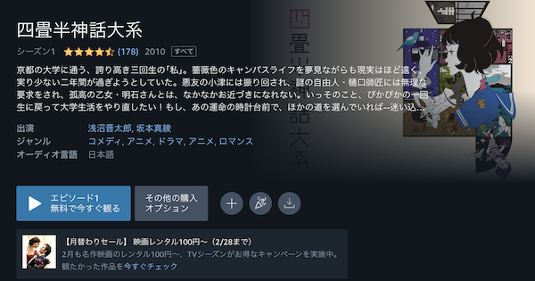 Amazonプライムはアニメ「四畳半神話大系」は無料で視聴できませんが、関連動画やシリーズ作品には見放題で配信されているものもあります。