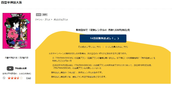 TSUTAYA DISCASは、準新作は8枚まで、話題作・旧作は枚数制限なしでお試し期間中に無料レンタルができ「四畳半神話大系」のアニメは、旧作なので無料視聴可能です。