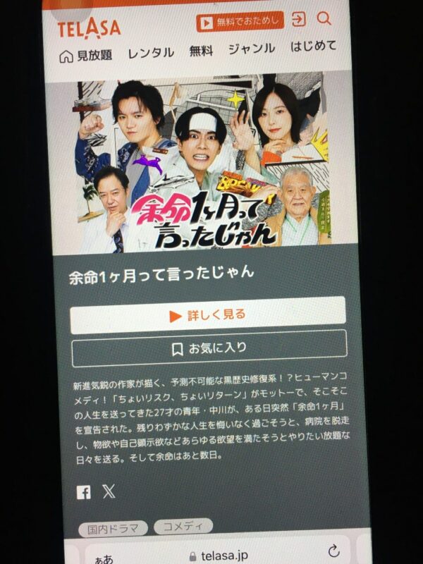 「余命1ヶ月って言ったじゃん」の映画は、TELASAで全話配信しており無料視聴ができます。