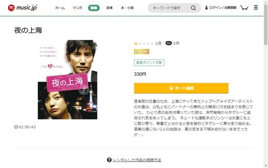 music.jpは、初回登録で1,600Ptが貰えるので「夜の上海」の映画を無料で見ることができます。