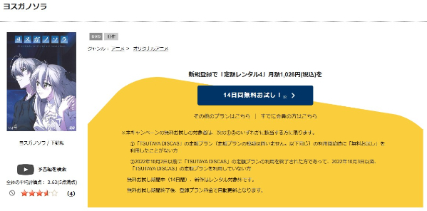 TSUTAYA DISCASは、準新作は8枚まで、話題作・旧作は枚数制限なしでお試し期間中に無料レンタルができ「ヨスガノソラ」のアニメは、旧作なので無料視聴可能です。