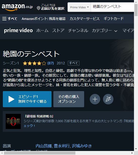 Amazonプライムはアニメ「絶園のテンペスト」は無料で視聴できませんが、関連動画やシリーズ作品には見放題で配信されているものもあります。
