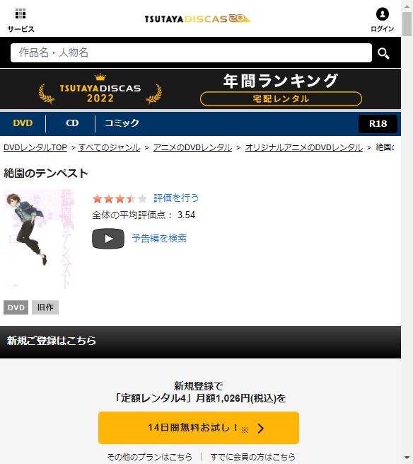 TSUTAYA DISCASは、準新作は8枚まで、話題作・旧作は枚数制限なしでお試し期間中に無料レンタルができ「絶園のテンペスト」のアニメは、旧作なので無料視聴可能です。