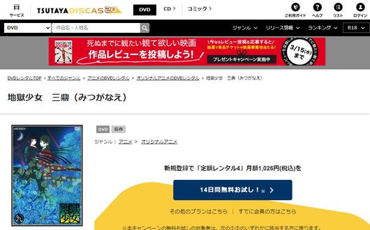 TSUTAYA DISCASは、準新作は8枚まで、話題作・旧作は枚数制限なしでお試し期間中に無料レンタルができ「地獄少女 三鼎」のアニメは、旧作なので無料視聴可能です。