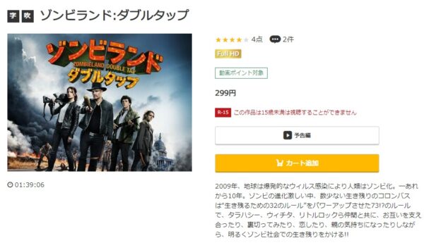 映画「ゾンビランド:ダブルタップ」は299円でレンタル配信してるので、フルで視聴できます。