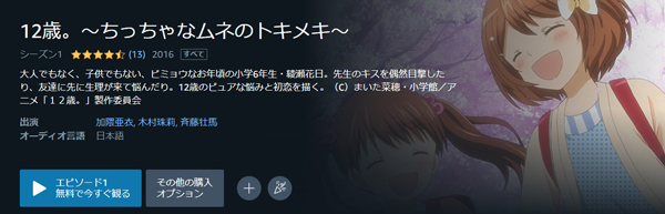 アニメ「12歳。~ちっちゃなムネのトキメキ~」はAmazonプライムで全話視聴できます。
