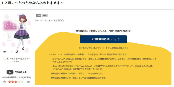 TSUTAYA DISCASは、準新作は8枚まで、話題作・旧作は枚数制限なしでお試し期間中に無料レンタルができ「12歳。~ちっちゃなムネのトキメキ~」のアニメは、旧作なので無料視聴可能です。