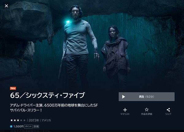 - 映画「65-シックスティ・ファイブ-」が初回特典600ポイント利用でお得に視聴できる。
